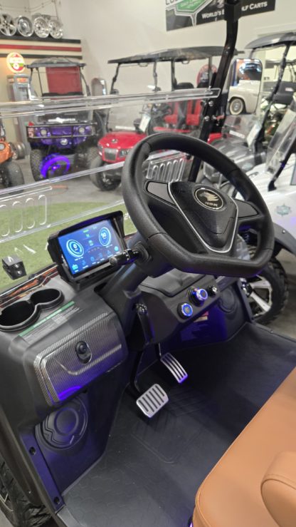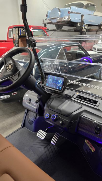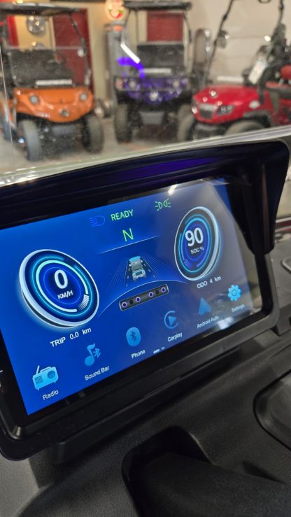 - Advanced touchscreen with speedometer, video player, Bluetooth for calls and music, radio, back up camera and battery Status indicator